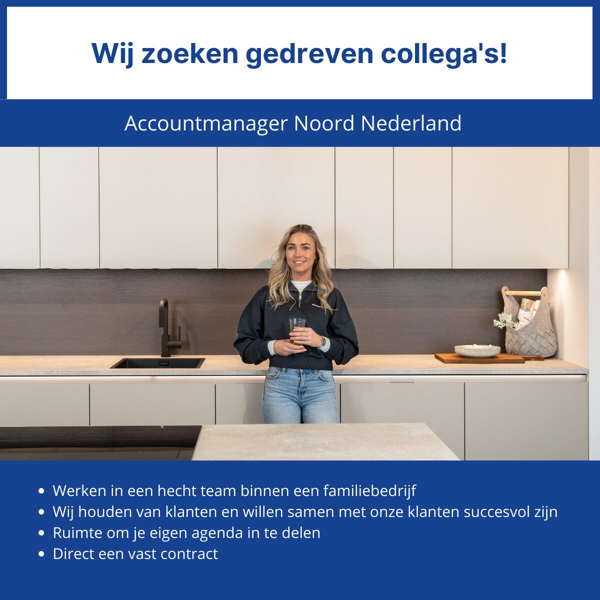 Wij zijn op zoek naar een proactieve accountmanager ter versterking van ons team voor de regio Friesland, Noord-Holland en Flevoland. Je start je dag met een kop koffie vanuit huis. Je checkt nog even je mail en dan ga je op pad om je klanten en nieuwe leads te bezoeken. Bij binnenkomst bij je eerste klant check je of de showroom is ingericht zoals je had afgesproken en zie je dat de keukens mooi zijn opgesteld: klaar voor verkoop!